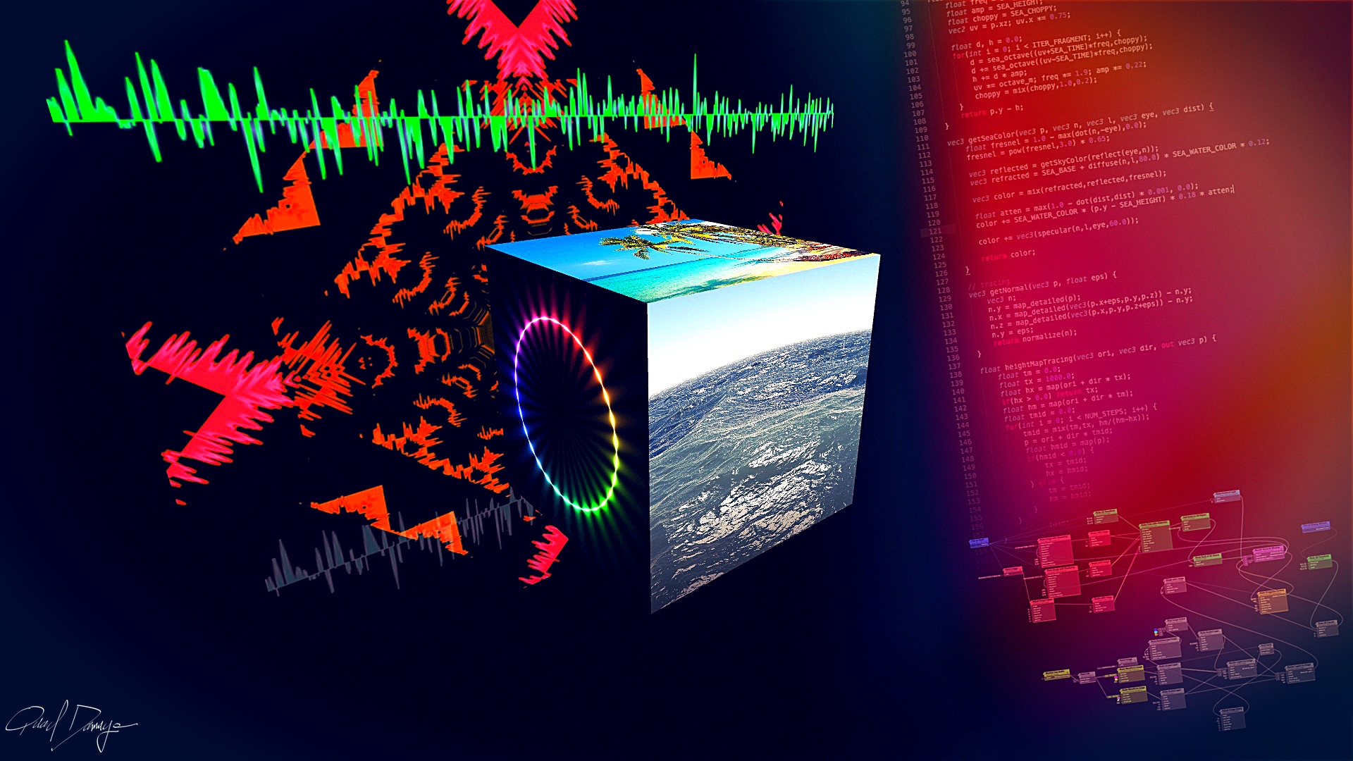 Nothing is real her, just lines of code. Vu is the staging platform, I played 3 fingers on a Midi keyboard through Garageband for the sound track, textures are based on shaders borrowed from Shadertoy. Regardless, in my mind, this was a week-end at sea!
